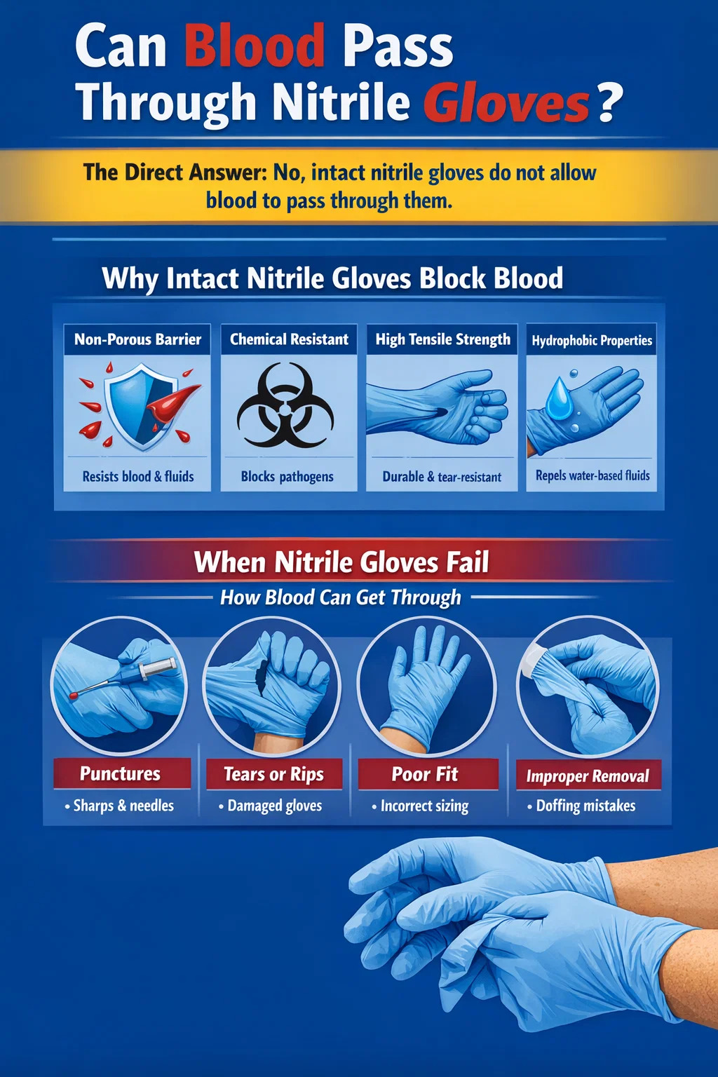Za normálnych podmienok, neporušené nitrilové rukavice neumožňujú prechod krvi cez ne. Nitrilkaučuk je hustý, syntetický materiál, ktorý tvorí súvislú bariéru proti tekutinám vrátane krvi a iných telesných tekutín. To je jeden z hlavných dôvodov, prečo sa nitrilové rukavice stali dominantnou voľbou v lekárskych, laboratórnych a núdzových prostrediach na celom svete.