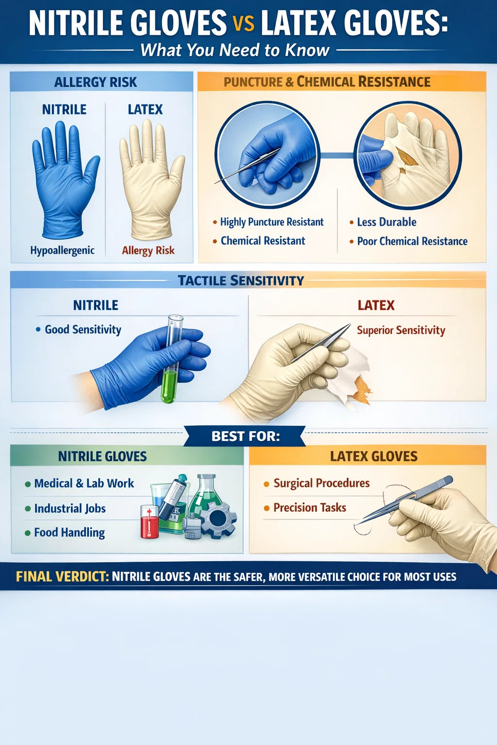 To znamená, že „bezpečnejšie“ závisí od vášho konkrétneho kontextu. Latexové rukavice majú stále významné výhody v hmatovej citlivosti a elasticite, vďaka čomu sú preferované pri určitých chirurgických a jemných procedúrach. Cieľom tohto článku je jasne rozobrať rozdiely, aby ste mohli urobiť informované rozhodnutie na základe vášho skutočného prípadu použitia – nie univerzálneho odporúčania.
