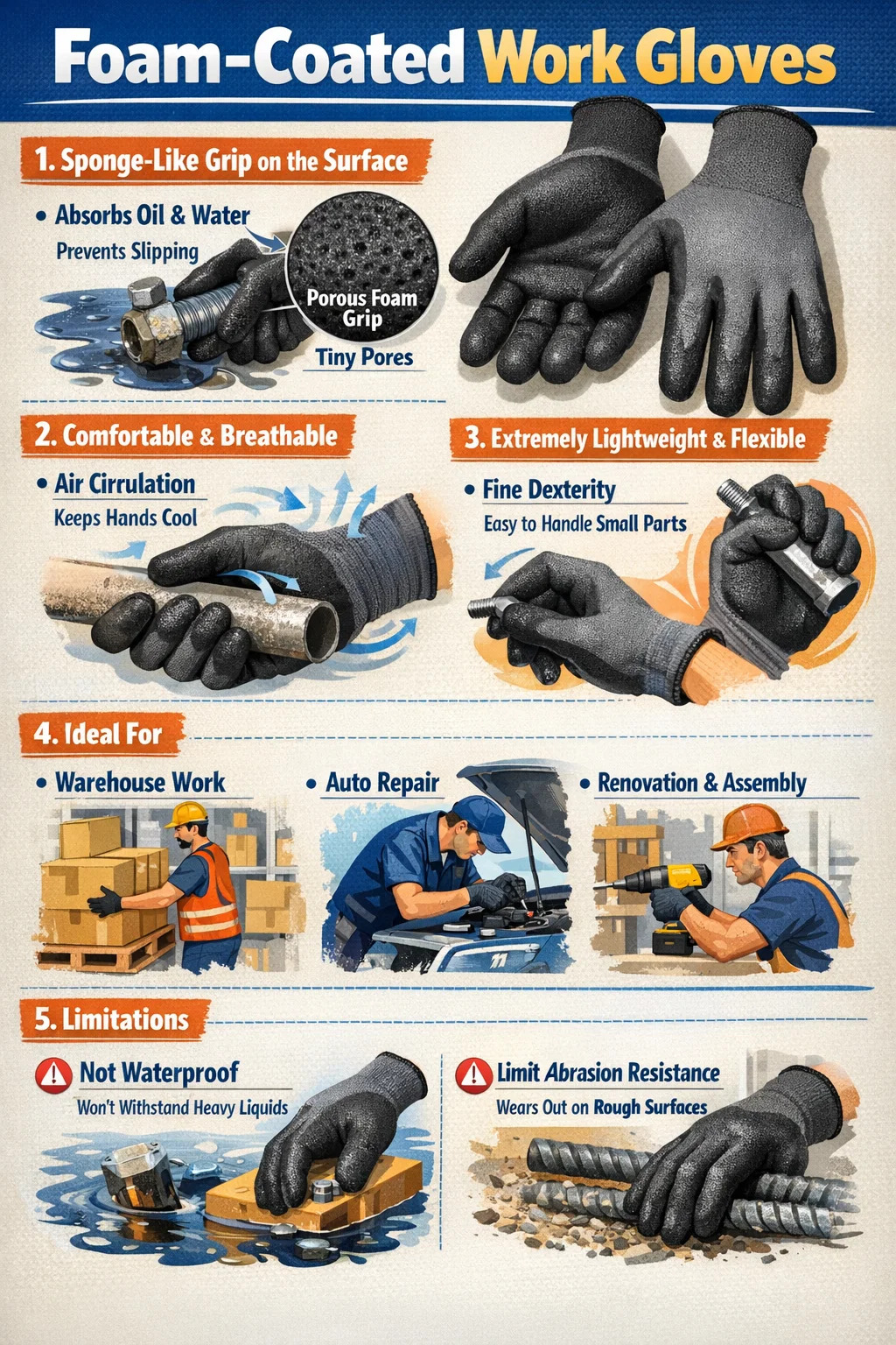 Penové rukavice to neznamená, že celá rukavica je vyrobená z peny; skôr označujú bežné látkové rukavice potiahnuté špeciálne upravenou vrstvou gumy alebo polyméru s malými pórmi.