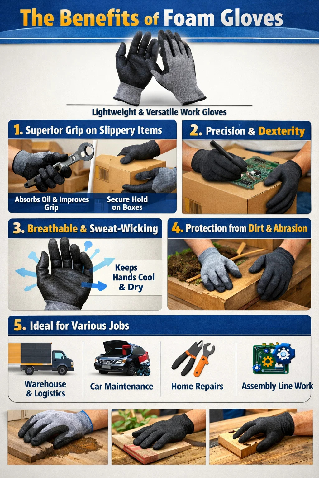 Priedušný a pot odvádzajúci: Keďže sa nazýva "penový", povlak nie je pevným blokom. Vzduch môže prechádzať cez drobné, voľným okom neviditeľné póry, vďaka čomu je oveľa priedušnejší ako čisté gumené rukavice. Po poobednej práci nebudú vaše dlane úplne suché, no aspoň nebudú lepkavé.