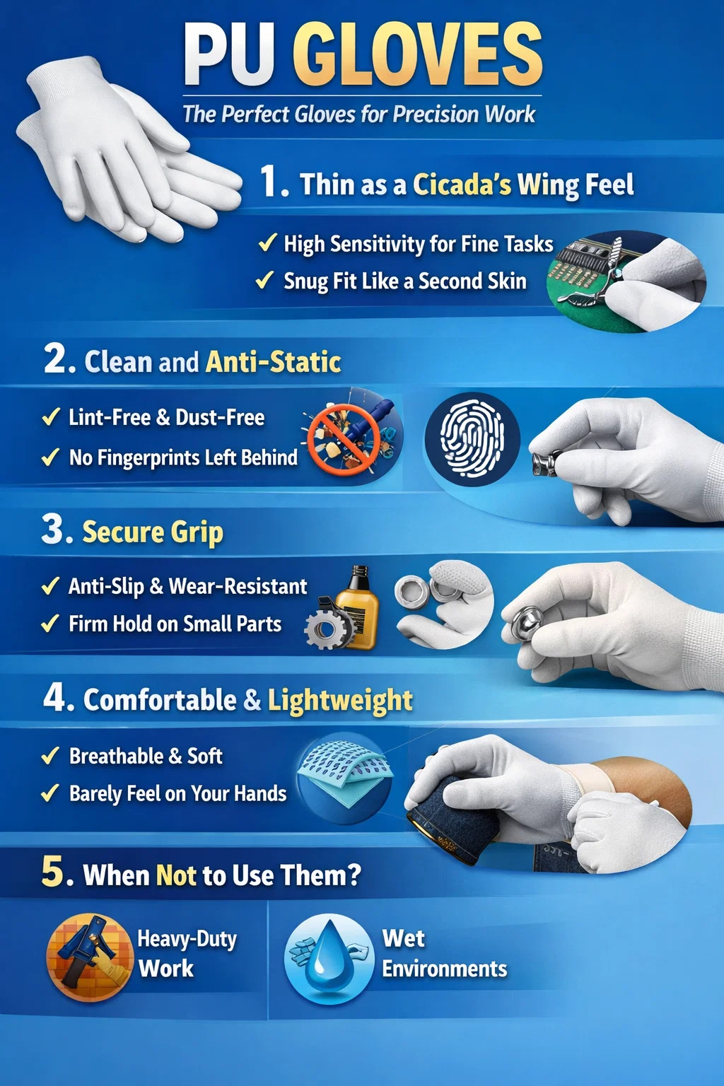 Tieto rukavice sú obzvlášť bežné v presnej elektronike, laboratóriách alebo pri detailných prácach pri renováciách. Tu sú niektoré z ich charakteristík:
