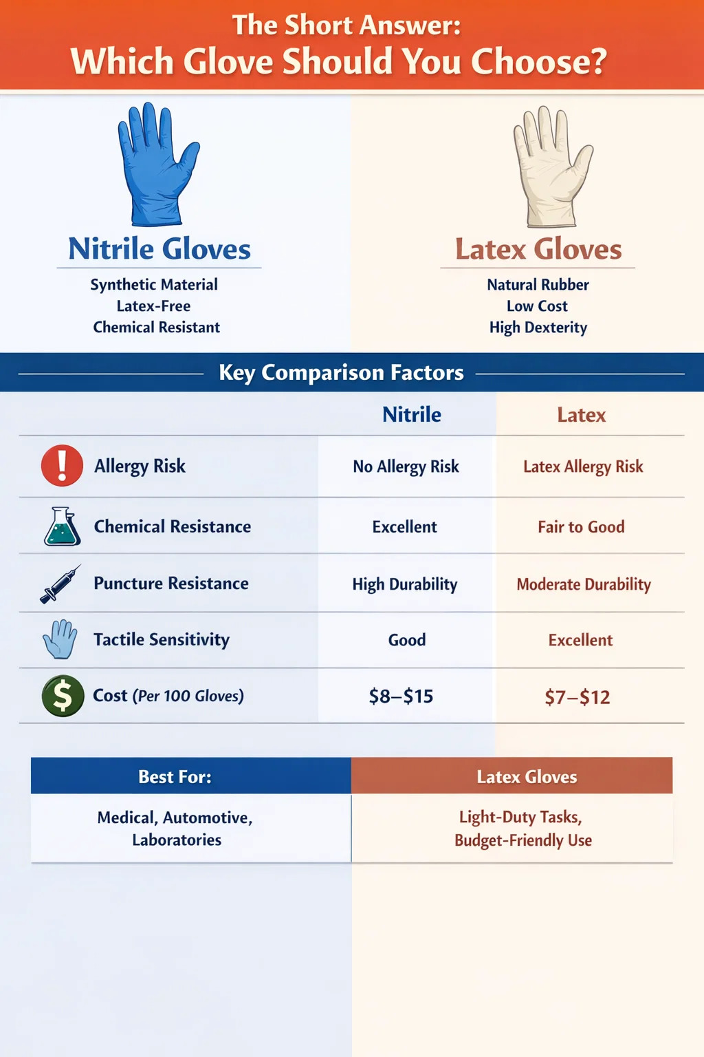 Jedným z najdôležitejších rozdielov medzi nitrilovými a latexovými rukavicami je riziko alergie spojené s latexom. Podľa Americkej asociácie pre alergiu na latex má alergiu na latex približne 1–6 % bežnej populácie, zatiaľ čo medzi zdravotníckymi pracovníkmi môže táto alergia dosiahnuť až 17 %. v dôsledku častej expozície v priebehu času.