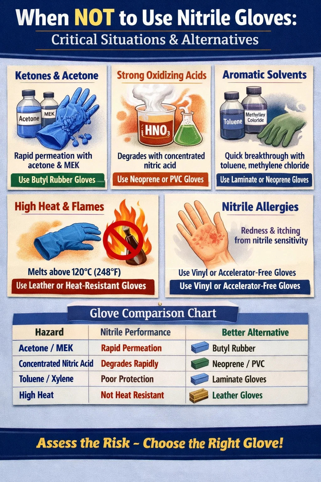 Krátka odpoveď: pri manipulácii s určitými ketónmi, silnými oxidačnými kyselinami alebo vysoko koncentrovanými rozpúšťadlami sa vyhnite nitrilovým rukaviciam; pri práci s extrémnym teplom alebo otvoreným ohňom; keď je kritická jemná hmatová zručnosť a trvanie úlohy je krátke; alebo keď osoba, ktorá ich nosí, má zdokumentovanú citlivosť na nitril. Čítajte ďalej pre úplný rozpis.